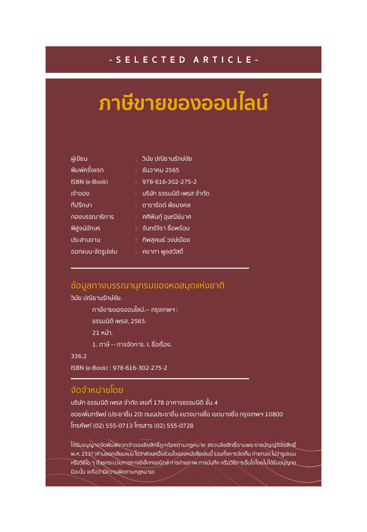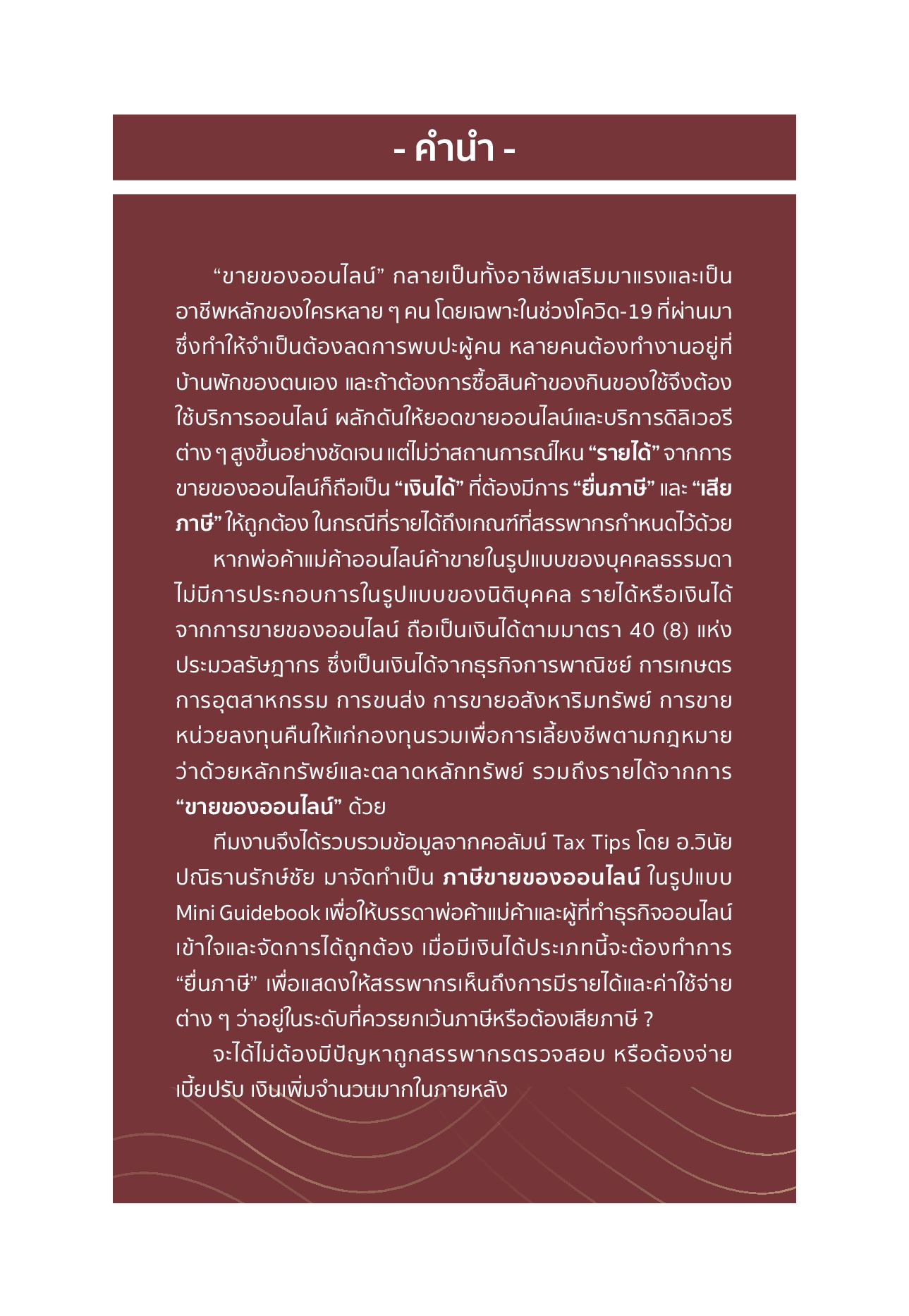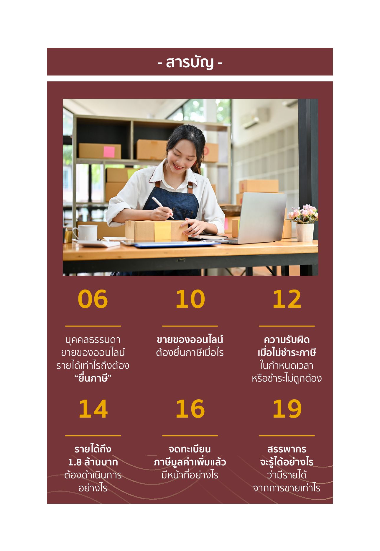 พ่อค้าแม่ค้าที่มารายได้จากการขายของออนไลน์เท่าไรถึงต้องเสียภาษี ช่วงเวลาที่ต้องยื่นภาษีคือเมื่อไร รายละเอียดรายได้ ค่าใช้จ่าย ค่าลดหย่อน จะนำมาคำนวณภาษีอย่างไร เล่มนี้มีคำตอบให้เพื่อความเข้าใจและจัดการภาษีได้ถูกต้อง ลดปัญหาถูกสรรพากรตรวจสอบหรือต้องจ่ายเบี้ยปรับและเงินเพิ่มในภายหลัง