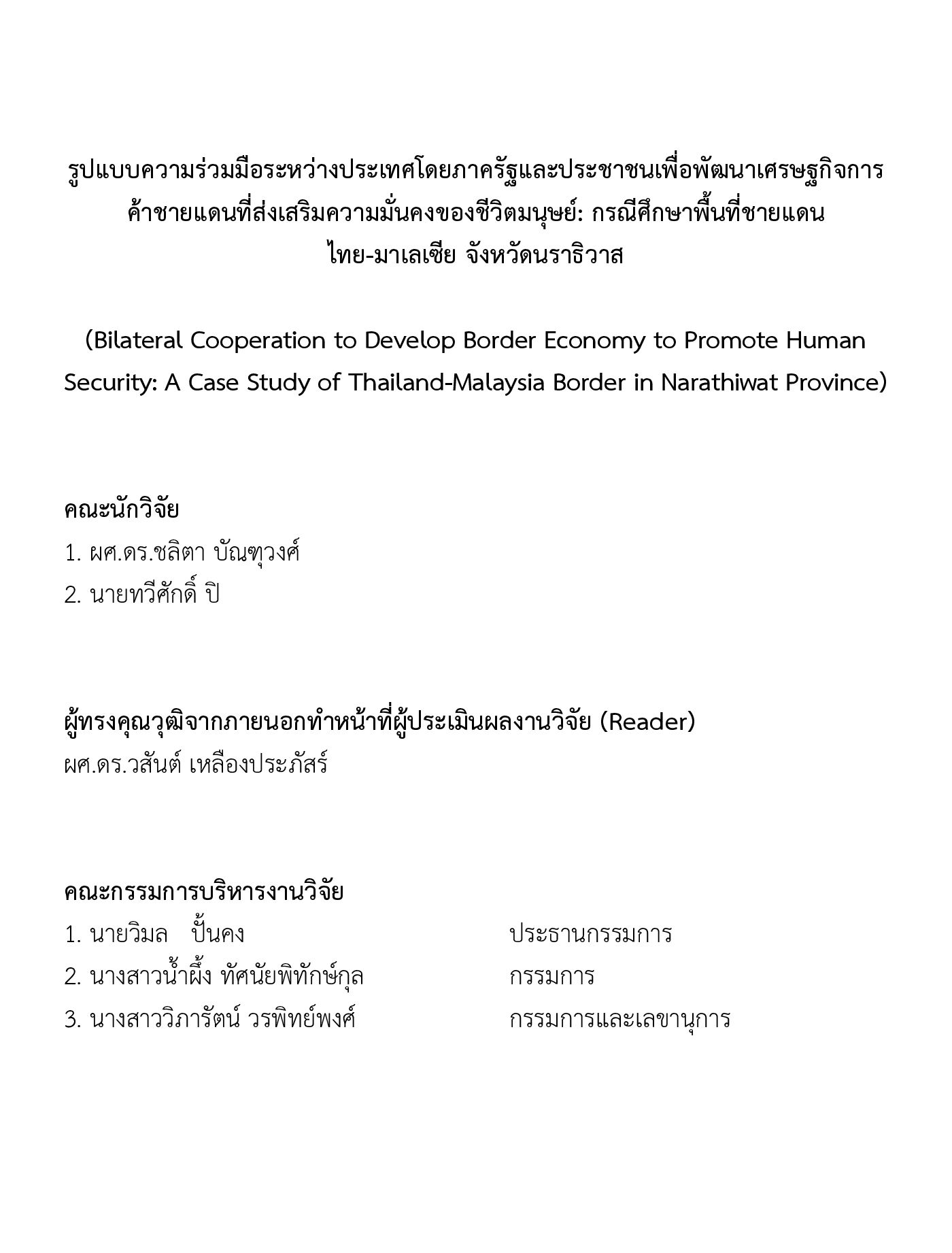 รูปแบบความร่วมมือระหว่างประเทศโดยภาครัฐและประชาชนเพื่อพัฒนาเศรษฐกิจการค้าชายแดนที่ส่งเสริมความมั่นคงของชีวิตมนุษย์: กรณีศึกษาพื้นที่ชายแดนไทย-มาเลเซีย จังหวัดนราธิวาส