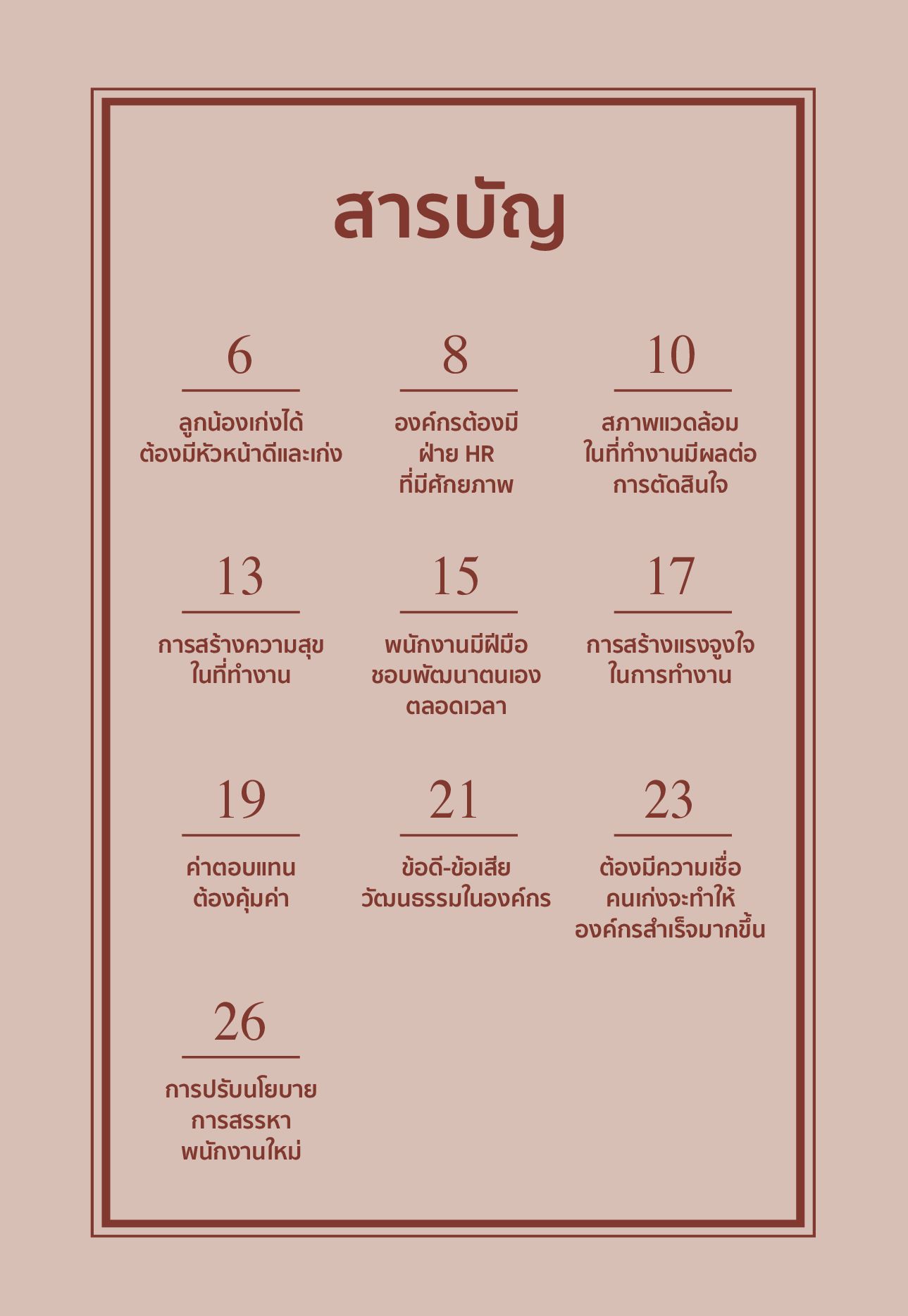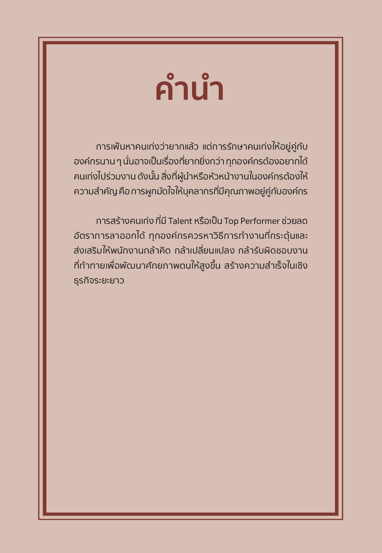 สิ่งที่ผู้นำหรือหัวหน้างานในองค์กรต้องให้ความสำคัญ คือ การผูกมัดใจให้บุคลากรที่มีคุณภาพอยู่คู่กับองค์กร ดังนั้น การสร้างคนเก่ง ที่มี Talent หรือเป็น Top Performer ช่วยลดอัตราการลาออกได้หนังสือเล่มนี้ จึงรวบรวม 10 วิธีรักษาพนักงานดาวเด่นที่จะกระตุ้นและส่งเสริมให้พนักงานกล้าคิด กล้าเปลี่ยนแปลงกล้ารับผิดชอบงานที่ท้าทาย เพื่อพัฒนาศักยภาพตนให้สูงขึ้นสร้างความสำเร็จในเชิงธุรกิจระยะยาว