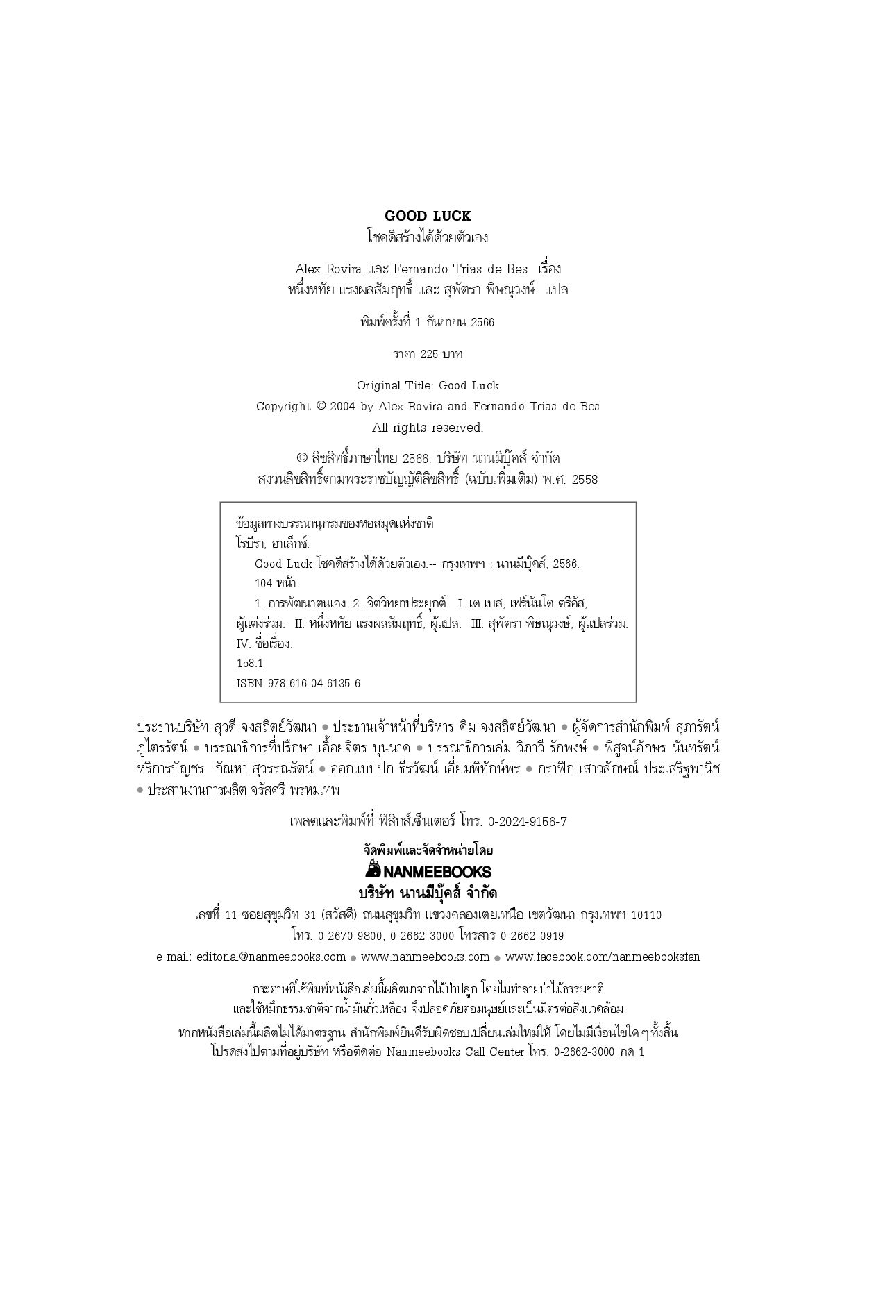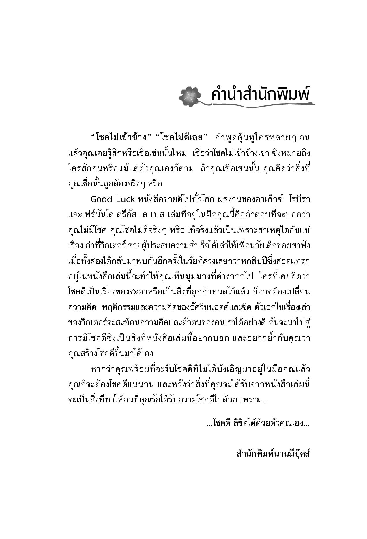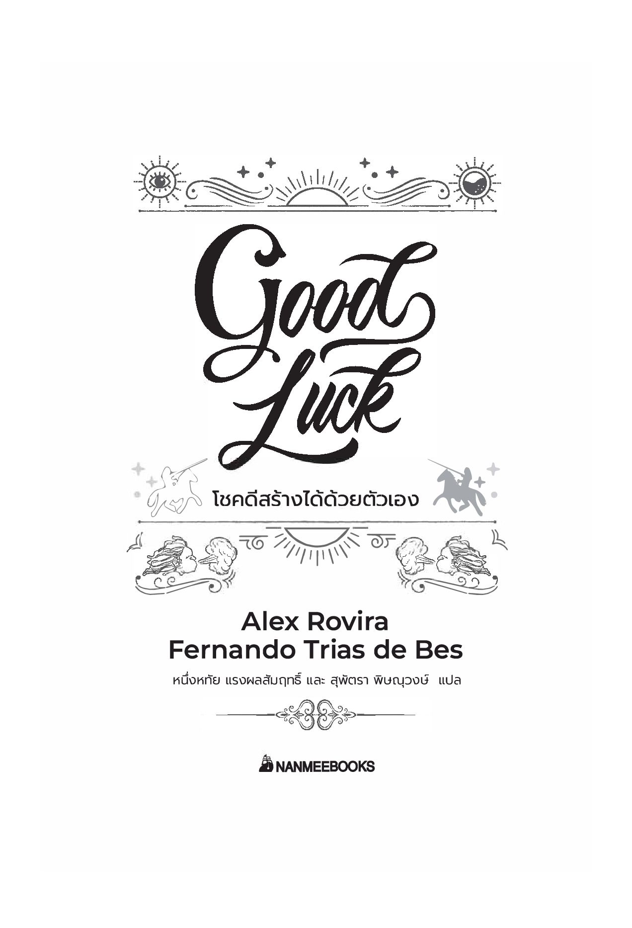 Good Luck หนังสือขายดีไปทั่วโลก ผลงานของอาเล็กซ์ โรบีรา และเฟร์นันโด ตรีอัส เด เบส เล่มที่อยู่ในมือคุณนี้คือคำตอบที่จะบอกว่า คุณไม่มีโชค คุณโชคไม่ดีจริงๆ หรือแท้จริงแล้วเป็นเพราะสาเหตุใดกันแน่ หนังสือเล่มนี้เน้นเล่าคอนเซ็ปต์ความแตกต่างระหว่าง ‘โชค (luck)’ และ ‘โชคดี (good luck)’ โดยเล่าผ่านนิทาน เรื่องราวของพ่อมดเมอร์ลินและอัศวินสองคนผู้ออกตามหาต้นโคลเวอร์ที่มีใบสี่แฉก เรื่องเล่าที่วิกเตอร์ ชายผู้ประสบความสำเร็จในชีวิตและธุรกิจ เปลี่ยนจากคนยากจนไม่มีกินกลายเป็นคนที่มีธุรกิจใหญ่โต ได้เล่าให้เดวิด เพื่อนวัยเด็กผู้มีชีวิตตรงข้ามฟัง นั้นจะทำให้คุณเห็นมุมมองที่ต่างออกไป ใครที่เคยคิดว่า โชคดีเป็นเรื่องของชะตาหรือเป็นสิ่งที่ถูกกำหนดไว้แล้วก็อาจต้องเปลี่ยนความคิด พฤติกรรมและความคิดของอัศวินนอตต์และซิด ตัวเอกในเรื่องเล่าของวิกเตอร์จะสะท้อนความคิดและตัวตนของคนเราได้อย่างดี อันจะนำไปสู่การมีโชคดีซึ่งเป็นสิ่งที่หนังสือเล่มนี้อยากบอกและอยากย้ำกับคุณว่า คุณสร้างโชคดีขึ้นมาได้เอง
