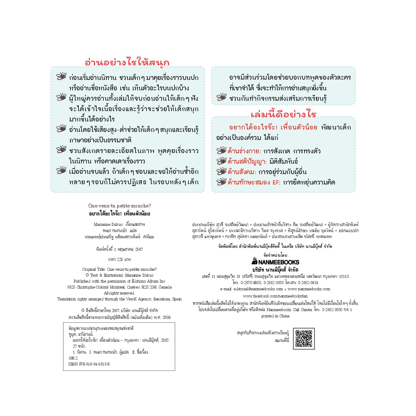 สนุกสนานไปกับนิทานสร้างเสริมประสบการณ์ชีวิตเรื่อง "อยากได้อะไรจ๊ะ! เพื่อนตัวน้อย" นิทานที่จะช่วยให้เด็ก ๆ มองเห็นความมีชีวิตของสิ่งมีชีวิตขนาดจิ๋ว ซึ่งแตกต่างกันในสายตาของผู้ใหญ่กับเด็ก ผ่านเรื่องราวของ "เจ้าแมวเหมียว" กำลังเล่นว่าวสนุก แต่เผลอเหยียบโดนเพื่อนตัวน้อยจนมันนิ่งไป ไม่ว่าจะชวนทำอะไรมันก็ไม่ยอมขยับ แล้วเจ้าแมวเหมียวจะทำอย่างไรดีนะ โดยในเล่มถ่ายทอดด้วยสำนวนชวนอ่าน พร้อมภาพประกอบสี่สี น่ารัก ชวนติดตาม ให้ความสนุกสนาน เพลิดเพลิน และเสริมสร้างทักษะการอ่านไปพร้อมกับส่งเสริมความผูกพันในครอบครัว